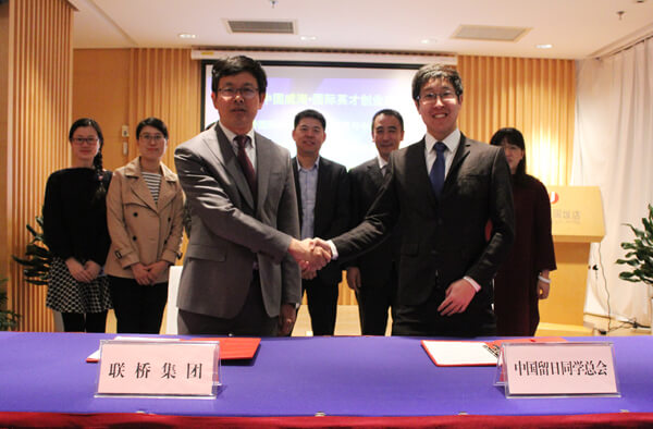 2017年3月5日,2017中國威海·國際英才創(chuàng)業(yè)峰會海外博士(日本)威海行活動開幕。期間,聯(lián)橋集團與中國留日同學總會簽訂了共建“中日高端人才交流平臺”合作協(xié)議。聯(lián)橋集團董事、副總經(jīng)理于福杰與中國留日同學總會副秘書長劉恩璽代表雙方簽字。