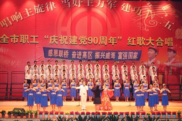 6月22日下午,威海市職工“慶祝建黨90周年”紅歌大合唱在國際會議中心激情上演。來自全市各行各業(yè)的職工代表歡聚一堂,用歌聲表達對黨和國家的深情和熱愛,向中國共產(chǎn)黨成立90周年獻禮。威海市委書記王培廷、孫述濤、劉玉黨、邊祥慧、張劍、畢禮偉、李鳳俊等領(lǐng)導(dǎo)觀看了演出。
